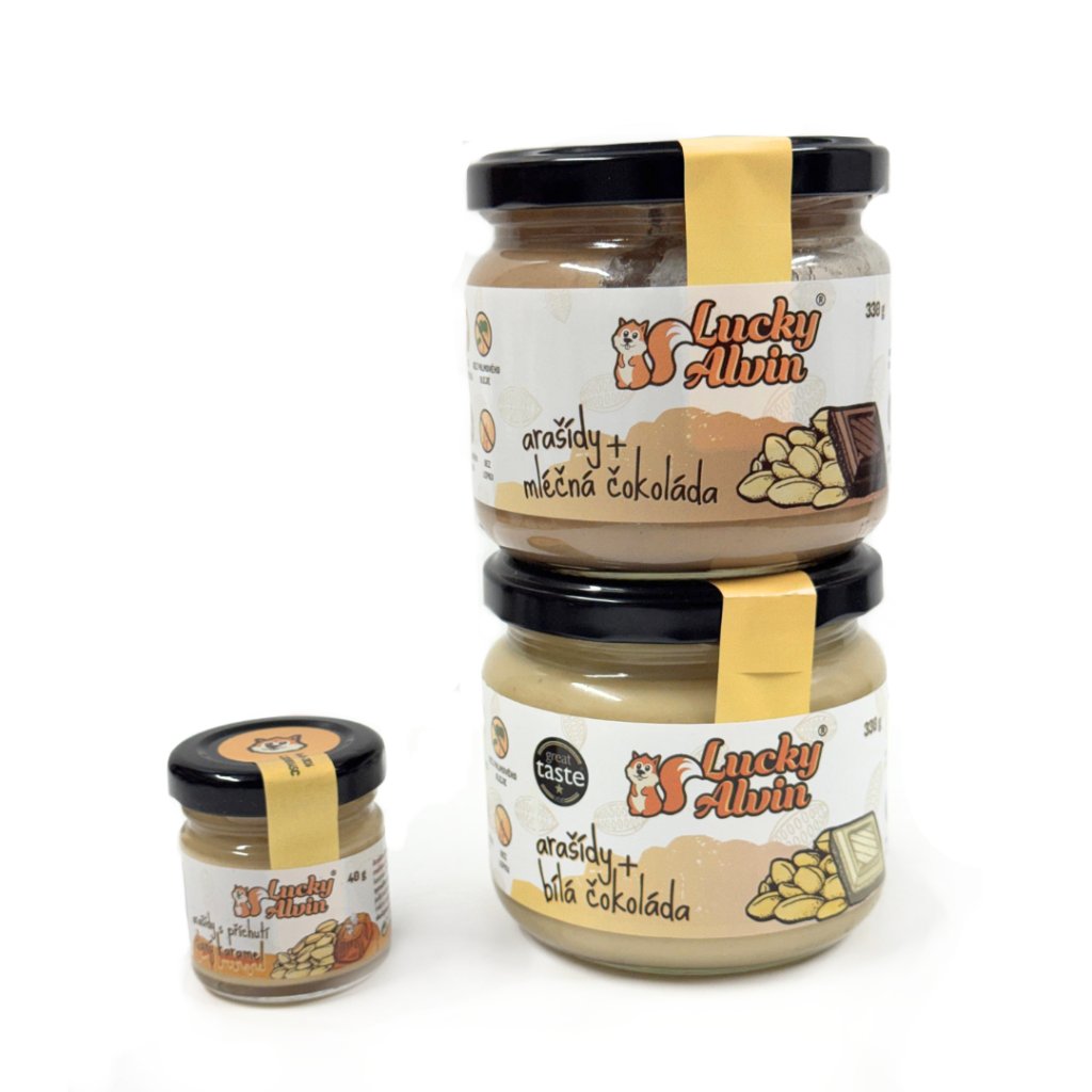 Arašídy & mléčná čokoláda / Arašídy & bílá čokoláda / Arašídy s příchutí slaný karamel (2×330 g + 40g sklenička zdarma)
