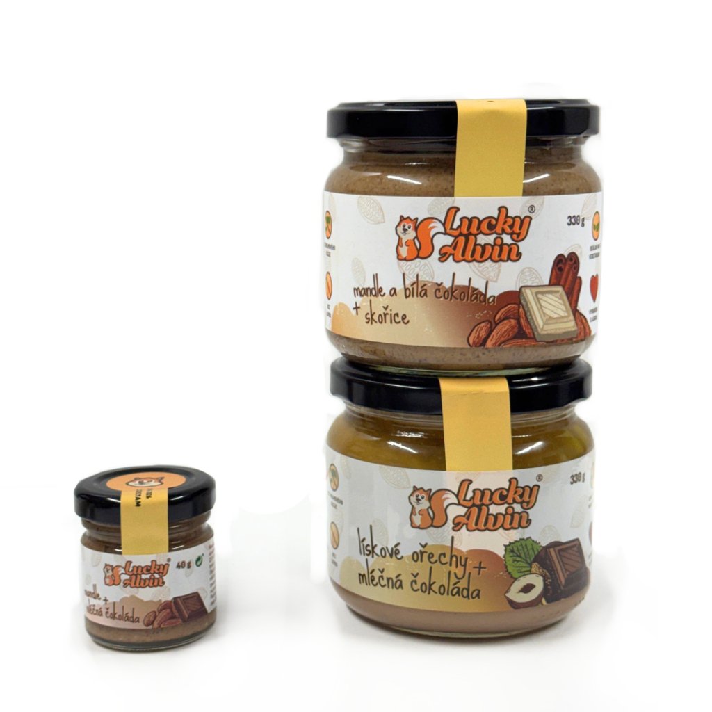 jemně kořeněný Mandle & bílá čokoláda + skořice a Lískový ořech & mléčná čokoláda, který se rozplývá na jazyku. Oba ručně vyráběné, bez přidaného cukru a palmového oleje, jen z prvotřídních surovin.