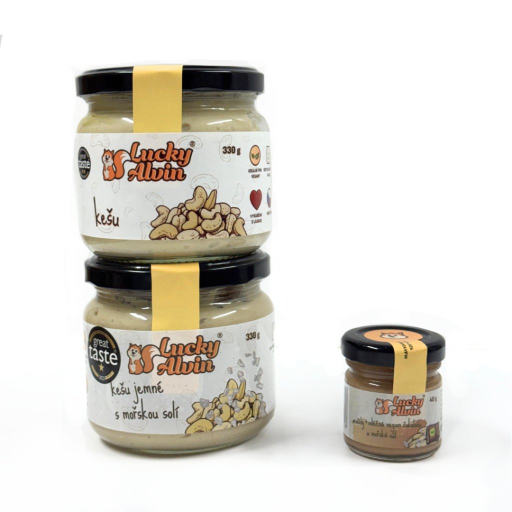 Kešu / Kešu jemné s mořskou solí / Arašídy s vegan mléčnou čokoládou a mořskou solí (2×330 g + 40g sklenička zdarma)